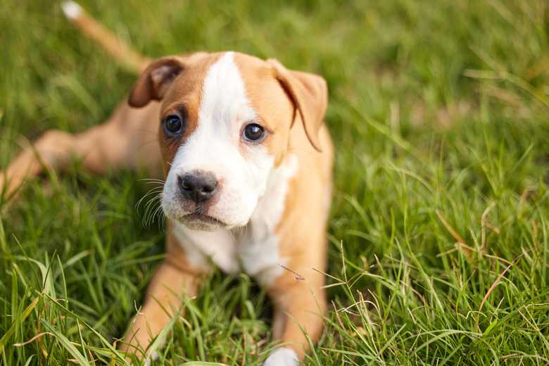 The key to successful potty training of any pit bull breed, including the American Staffordshire terrier and Staffordshire bull terrier, is to regularly take out your puppy for potty breaks. Pick a quiet spot outdoors that's away from other dogs, especially if your puppy hasn't yet been properly socialized. Each time you go outside, go to that same spot and give your pup a command, like "potty." If your little one eliminates in that spot, lavishly praise and treat your dog for this accomplishment. Should your puppy not eliminate, head back inside for a few minutes and return to try again.